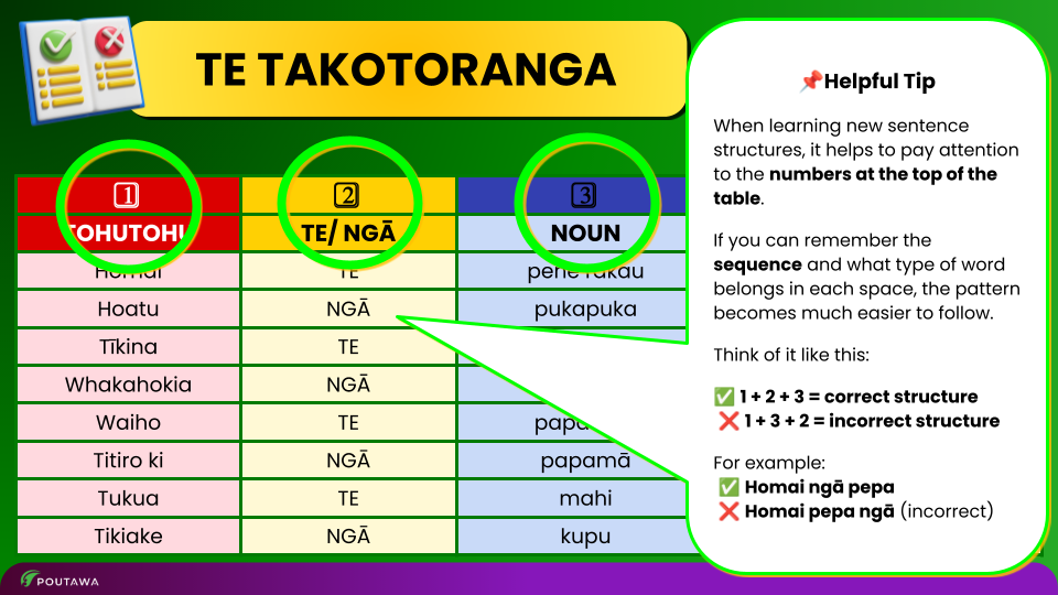 - This task emphasises recognising meaning and applying language patterns while strengthening independence in written reo.